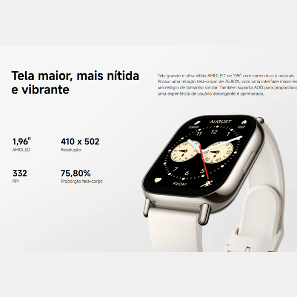 Com uma tela AMOLED vibrante de 1.96 polegadas, ele oferece uma experiência visual rica e personalizável.