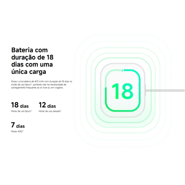 - Bateria de Longa Duração: Desfrute de até 18 dias de uso com uma única carga, dependendo do uso.